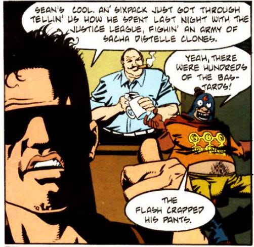 Je crois en avoir déjà parlé ici, mais j’ai lu l’intégralité de ce qui est disponible de The Last War in Albion, un essai où Elizabeth Sandifer, prend comme prétexte la rivalité Alan Moore/Grant Morrison pour écrire une histoire de l’invasion anglaise de la bd américaine dans les années 80/90. C’est passionnant, riche et m’a fait replonger dans quelques titres et notamment, ce Hitman que je n’avais encore jamais lu. Derrière les stratégies publicitaires et les crises d’égo de ses contemporains (plus que rivaux), une certitude se dégage : Garth Ennis est un des scénaristes essentiels des trente-cinq dernières années (son nouvel album La Guerre le prouve une fois de plus).